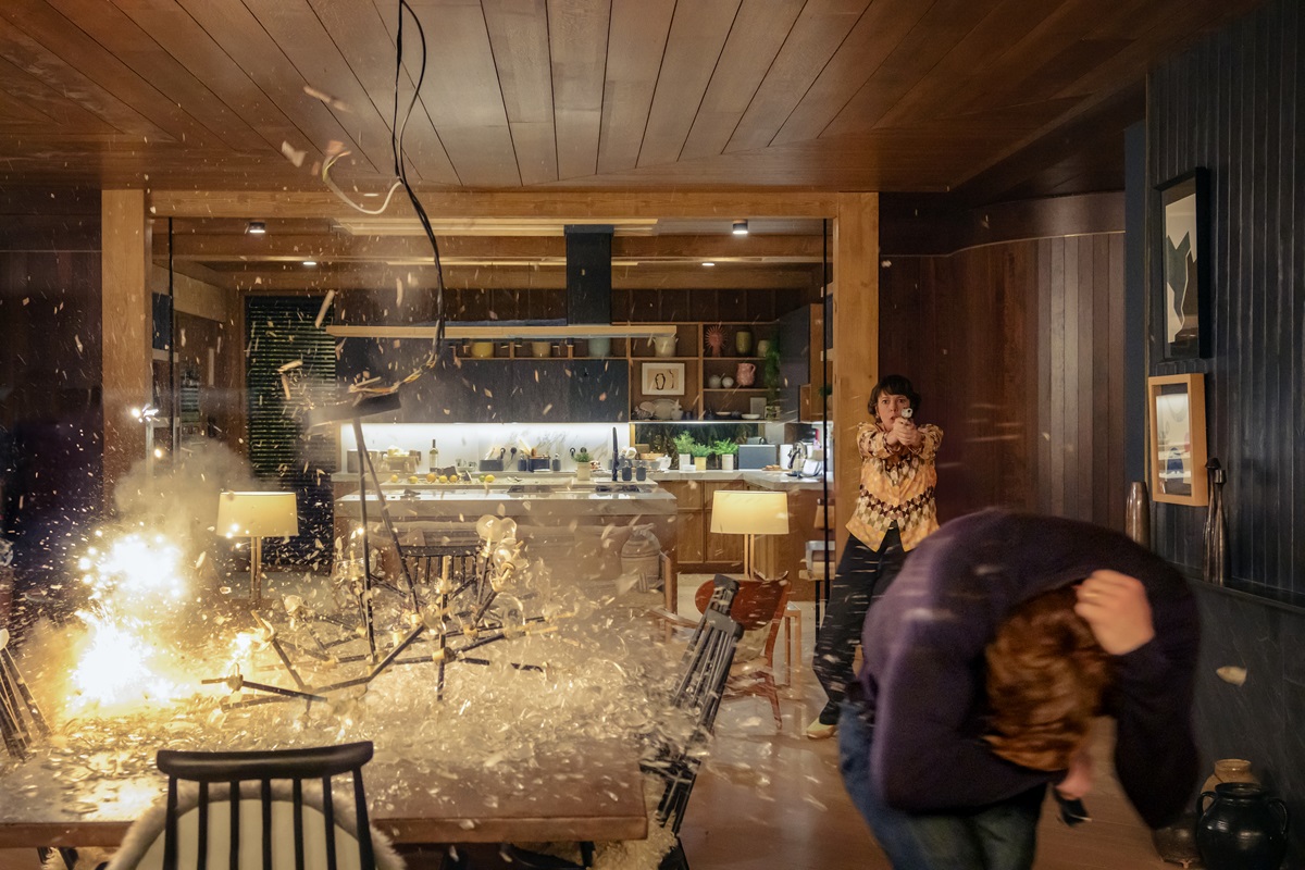 建築家として順調にキャリアを築いていたものの、一夜にして仕事も地位も名誉もすべて失い、取り乱して絶叫する夫・テオ。そして、ついに勃発した夫婦喧嘩に銃を持ち出し柱に隠れる妻・アイビーの様子と、豪華なシャンデリアに弾丸が命中し、ガラスが爆散するという大惨事となった部屋の中をテオが逃げ惑う様子をとらえている。