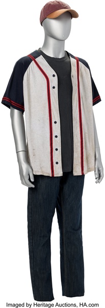 グレン・リー(スティーブン・ユァン)オリジナルコスチューム6点セット。赤いベースボールキャップ(「Poof GlennDBL」の書き込みあり)、ダークグレーの半袖Tシャツ2枚、ブルーデニムジーンズ(タグに「Glenn」の記載あり)、そして赤いトリムが施されたオフホワイトとネイビーのラグランスリーブ・ボタン付き野球ユニフォーム2枚(それぞれタグに「Glenn」「Glenn DBL」の記載あり)で構成されている。『ウォーキング・デッド』シーズン1第2話で、グレンが、アトランタでウォーカーに囲まれた戦車からリックを救う場面でこのコスチュームを着用している。