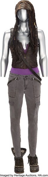 ミショーン(ダナイ・グリラ)のコスチュームとアクションシーン撮影用の刀。フード付きポンチョを含むオリジナルの衣装に加え、様々な色合いのブラウンの髪で作られたウィッグ(ゴールドのビーズつき)、マルチカラーのヘッドバンド、アイボリーとブラウンの革が柄に巻かれた高密度ゴム製のアクション用刀(長さ約109cm)などが含まれる。これらのコスチュームは『ウォーキング・デッド』シーズン3を通してミショーンが着用しており、エピソード1「Seed(厳しい冬を超えて)」で初登場した。