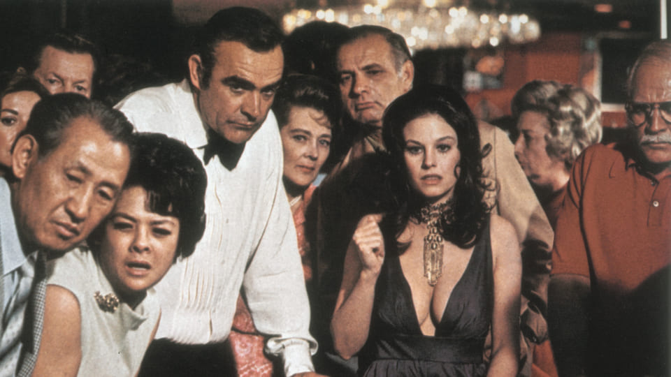 ショーン・コネリーがボンド役に復帰した人気スパイアクションシリーズ第7弾。ダイヤモンドの密売を巡り、ボンドが悪の秘密結社スペクターとの戦いを繰り広げる。片輪走行を交えたラスベガスでのカーチェイスやユーモアを強調した物語など、華やかで陽気なムードが特徴。月面探検車でのチェイス、2人組の女殺し屋とボンドの死闘など、時代を先取りした要素も見どころ。前作の興行的失敗を挽回し、シリーズ存続を決定づけた。