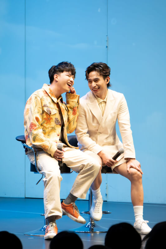 次の成王CPは、大人の魅力たっぷりのセクシーなシーン。林家佑と林詠傑も舞台右端で照れた様子で見ていて、会場からは歓声が上がっていた。このシーンは、スタッフによると「全く演技指導がいらないくらい、ジアヨウさんがリードしてくれた」とのこと。林家佑は「リハーサルの時は位置を確認していたのに、エドウィンなら自分の即興に応えてくれると思って撮影しました」、林詠傑「撮影が始まるまではリハーサルのとおりだと思っていましたが、アクションの声が掛かるとジアヨウにいきなり首を押さえられて、驚きました。でもこのままで続けるんだと思って、自分たちの演技が生まれたという事かと思います」と話す。